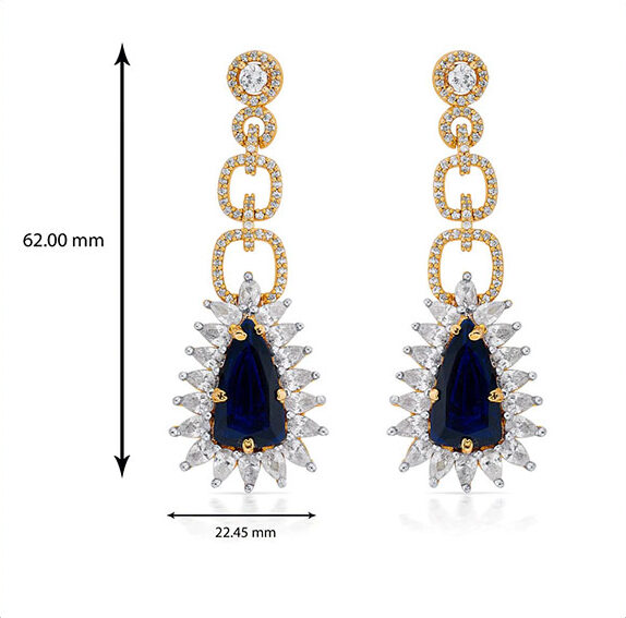 Crafted from durable brass with rich gold plating, these earrings offer both style and comfort. The embellished surface of shimmering white CZ stones beautifully complements the deep blue drops, making this pair ideal for important events, formal office wear, or glamorous party outfits.